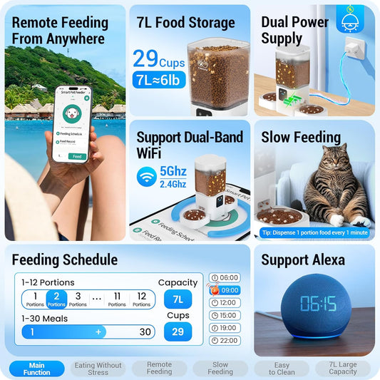 Automatic Cat Feeder with Slow Feed for 2 Cats: 5G Wifi Automatic Dog Feeder with 7L Large Cat Food Storage Container,Cat Food Dispenser with Alexa for Multiple Pets.